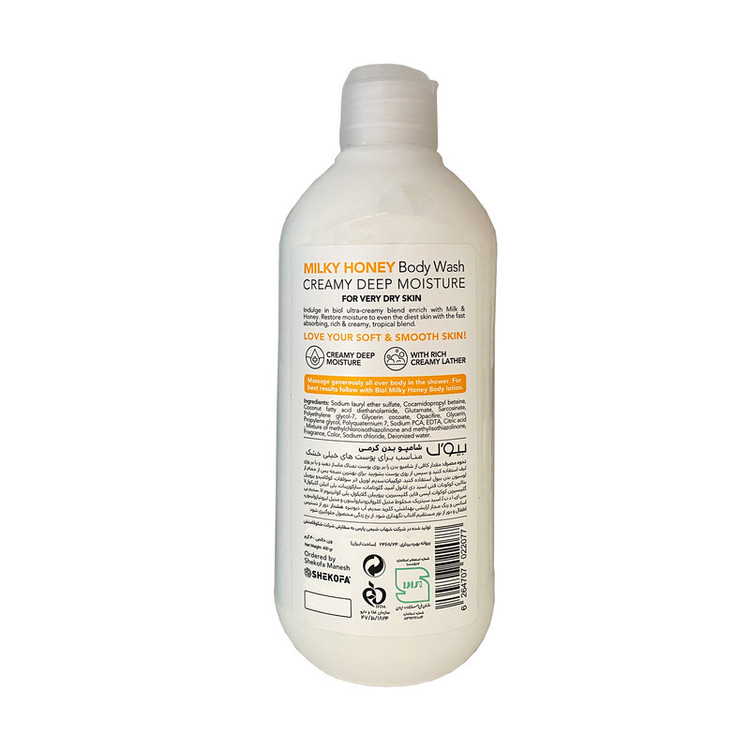 شوینده با بافت کرمی و محافظ پوست با خاصیت مرطوب کنندگی و نرم کنندگی پوست با رایحه شیر و عسل