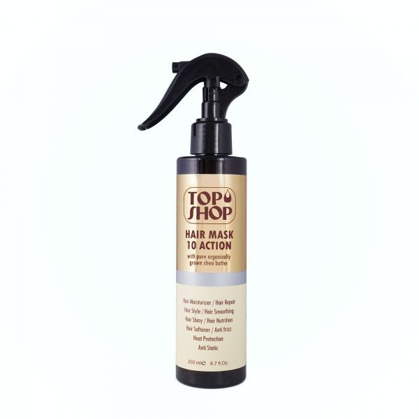 این محصول که جز جدید ترین و باکیفیت ترین محصول های برند تاپ شاپ میباشد که سر شار از روغن شی باتر، روغن ماکادمیا، روغن جوتنه کندم و پامچال می باشد. این ماسک مو ده کاره نیاز به آبکشی نداشته و به تنهایی میتواند کار سه محصول اصلی و پرطرفدار مراقبت مو را انجام دهد یعنی سرم های مو که حالت دهنده هستند و مانع آسیب حرارت سشوار به ساقه مو ها میشوند. ماسک های مو چه حالت با آبکشی چه بدون آبکشی که موها را احیا، ترمیم، نرم، لطیف و بسیار خوش حالت میکنند و نیز ماسک های دوفاز که موها را آبرسانی کرده و تقویت میکنند.